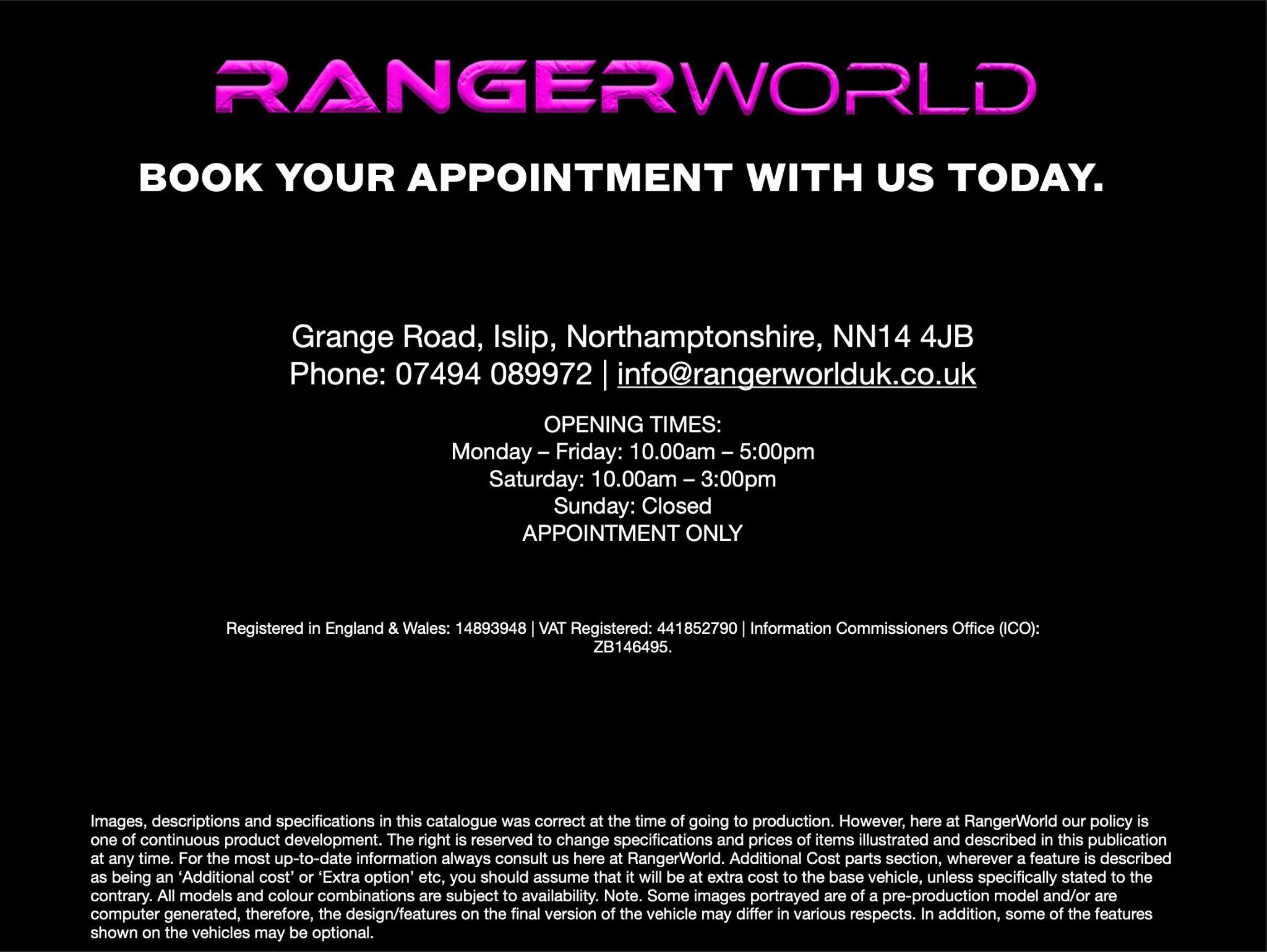 WELCOME TO RANGER WORLD, WE HAVE THE LARGEST STOCK OF BESPOKE BUILD RANGERS IN THE UK PART EXCHANGE & FINANCE AVAILABLE (REPRESENTATIVE 9.9% APR) WE ARE A CREDIT BROKER NOT A LENDERTO VIEW PLEASE CALL AS WE ARE STRICTLY BY APPOINTMENT ONLY. THIS ENABLES US TO GIVE YOU OUR UNDIVIDED ATTENTION. OUR STOCK CHANGES DAILY SO PLEASE CONFIRM WITH US THIS VEHICLE IS STILL AVAILABLE. ALL WRAPS AND SPORTBACK CANOPY IN THE PHOTOS ARE EXTRA-COST OPTIONSINCLUDED IN THE PRICE IS THE FOLLOWING SPEC.1: 20” Upgrade wheels and tyres… 4 STYLES AVAILABLE2: CENTURIAN edition Wide Bodykit.3: RW Front Grill.4: Front Bonnet Apron5: Bonnet Scoop.6: Roof light bar.7: Bonnet Scoop.8: Front City Bar.9: black brake calipers.@ EXTRA COSTROLLER SHUTTERS £2500SPORT BACK/CANOPY £3000.BODYWRAP £3000At Ranger World, we take pride in offering a unique and personalised experience for enthusiasts of the iconic Ford Ranger and Mustangs. Specialising in these Icons means we go beyond the ordinary to deliver vehicles that reflect your style and preferences. Our vehicles are hand-built by our skilled team in Northamptonshire. Here at RANGER WORLD, we are a small passionate team dedicated to making purchasing your new car the best experience you will ever have! No sales staff just enthusiasts. Our unique and stunning showroom is nestled in 150 acres of beautiful Northamptonshire countryside. 1 mile from J12 of the A14….WANTED PLATINUM DERANGED RAPTER F150 KAHN REVERE GVE URBAN CINCH OVERFINCH VVS SEEKER DIRTY UNICORN AUTOLAB GC SHELBY RAPTOR FAIR PRICES PAID FOR THE RIGHT EXAMPLES! RANGER WORLD exercises all reasonable care and skill in providing you with spec check Data. All rights reserved. RANGER WORLD does not accept responsibility for errors, omissions, liability or loss suffered due to the use of spec check Data by any user or other party. spec check is a guide and all equipment should be physically verified, RANGER WORLD does not warrant any information provided as part of the spec check.